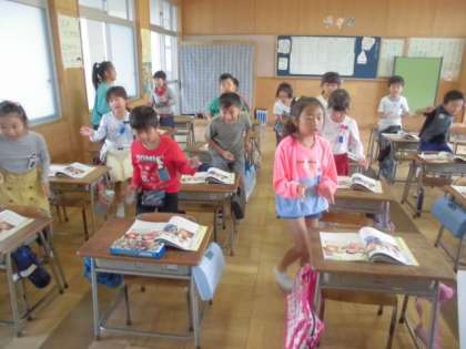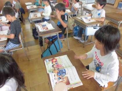 「むらまつり」を歌いながら、リズムに合わせて手を叩いたり、机を叩いたりしました。