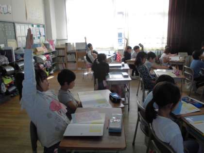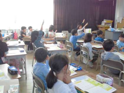 今日から、新しい(下)のノートでの学習が始まりました。子どもたちはとても嬉しそうに名前を書き、文字の中心に気をつけて練習を行いました。良い姿勢で話を聞き、自分の意見を発表することができました。