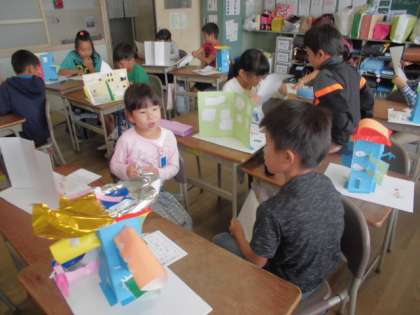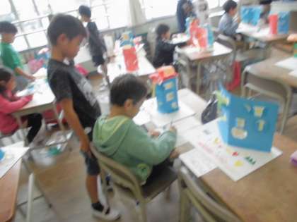 友達の作品のよいところを見つけて、鑑賞カードに書いたり、隣の人へ紹介したりしました。