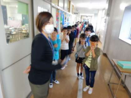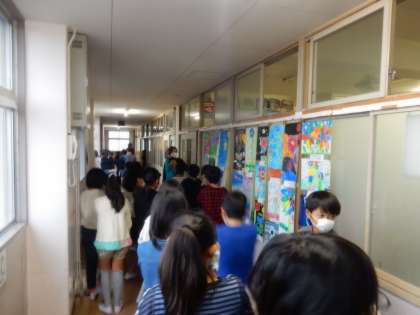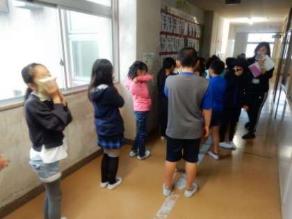 本日は避難訓練がありました。雨天のため、廊下に並ぶまでの訓練ですが、みんな真剣に取り組むことができました。家庭科室からの火災ということで、ハンカチやマスクで煙を防ぐことが確認できました。