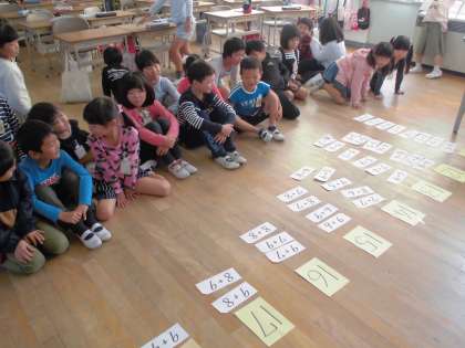 今日は、繰り上がりのあるたし算を、同じ答えどうしで並べました。
