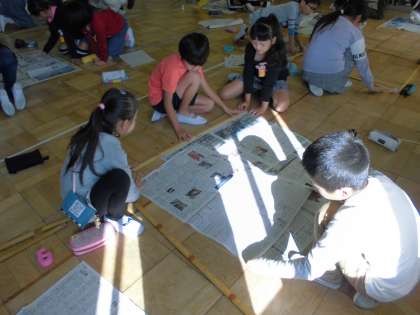 今日の算数は、1平方メートルの広さを実際に作ってみました。ぴったり1mの長さにそろえるのは難しかったのですが、みんな広さを実感できました。