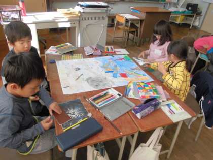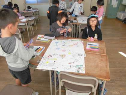 朝日壮の訪問の時に、利用者の方と遊ぶためのすごろくを一生懸命に作っています。