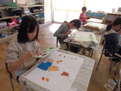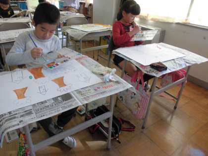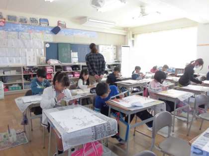 今日の図工の様子です。図工の学習では、読書感想画を描いています。印象に残った場面を想像して絵に描いています。