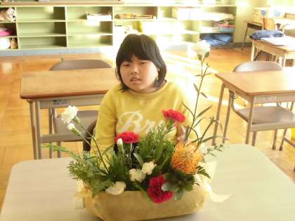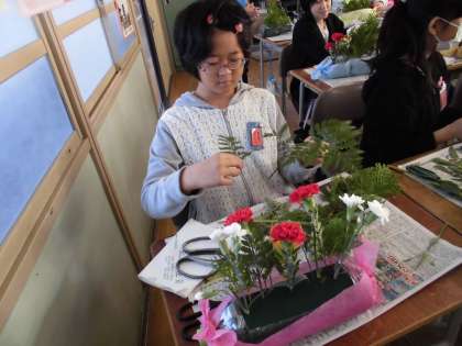 6年生は、外部講師の方に指導を受けながら、華道体験をしました。自分なりにバランスを考えて、オアシスに花を挿していきました。素敵な生け花になりました。