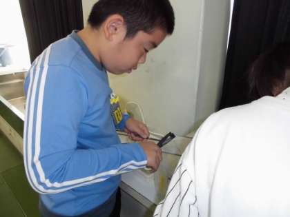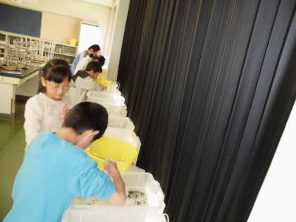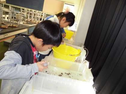 ホタルの飼育をしている4年生です。幼虫も、だんだん大きくなりました。4年生の子どもたちが一生懸命掃除をしたり、エサを与えたりと愛情を込めて育てている証拠です。