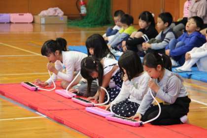 マットの実演とピアニカの演奏も大きな拍手をいただきました。最後に、朝東っ子らしく朝日東小学校の校歌を歌いました。朝日東小学校の1年生らしい、立派な歌声でした。