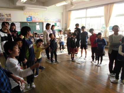 なかよしあそびでは、6年生のお兄さん、お姉さんと「新聞のりゲーム」をしました。