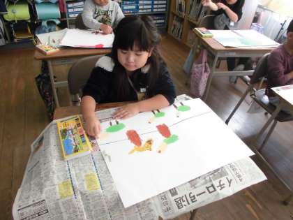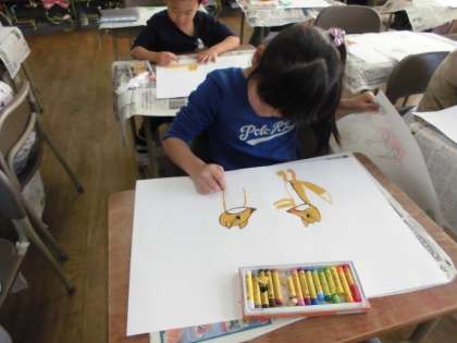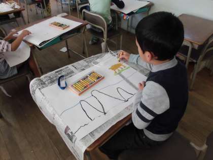 今日は、クレヨンを使ってきつねや背景を描きました。
