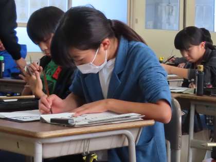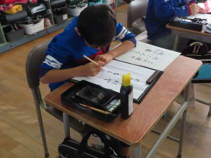 書写の授業で、小筆を使って書きました。