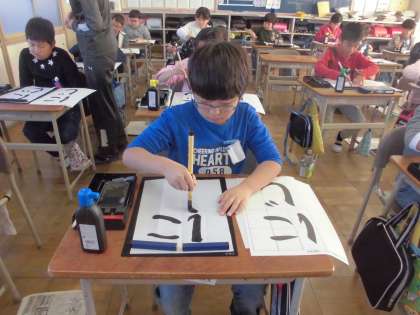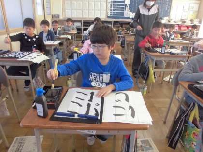 今日の書写の時間は、「にじ」の練習をしました。ひらがなの柔らかさを出すために、筆運びの練習をしてから書きました。