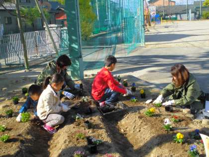 親子で協力して、ノースポール、アリッサム、パンジーなどを植えました。