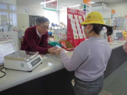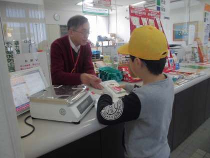 郵便局で一人ひとり、お金を出して年賀はがきを買いました。みんな上手に買うことができました。