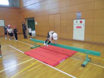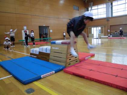 今日の体育は、とび箱でした。両手で体を支えて、ジャンプ、ジャンプ、ジャンプ!!