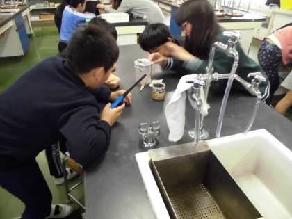 カイロであたためたビーカーの中を、線香の煙がどのように動くかを観察しています。
