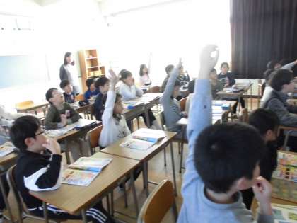 教科書にある物をよく見て、先生が言う色と形が合う物を指さしました。