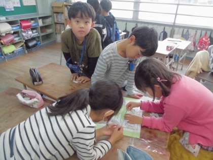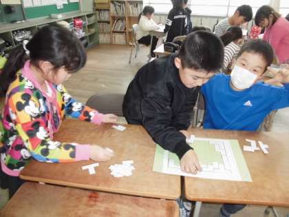 算数では、2学期のまとめを行っています。今日は、九九の表を完成させるパズルに取り組みました。答えを考えながら、友達と協力して行いました。