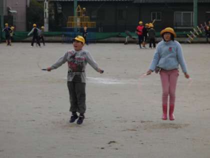 お昼の休み時間に、たんぽぽ学級の二人が元気になわとびの練習をしていました。二人とも、とび方を工夫しながら練習をしていました。