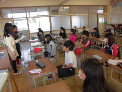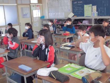 今日の朝の時間に保健委員会の子が来て、マスクの着用の仕方やインフルエンザウイルスについての話をしてくれました。くしゃみをすると、菌がとても長い距離跳ぶことを目で見て知り、驚いていました。手洗いうがいの基本もしっかりとし、予防に心がけていきたいですね。
