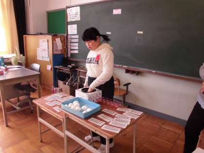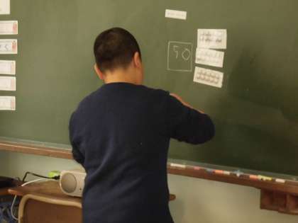 くじ引きボックスから数のカードを引き、黒板に書いて、数図カードを選びました。