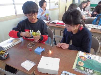 今日の理科の学習では、手回し発電機を使って電気を作りました。豆電球と発光ダイオードにつないで、どのように回したら電気がつくのかや、回すときの重さの違いに気づき、楽しんで実験をすることができました。