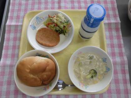 今日の給食は、イタリアの日にちなみ、イタリアのクリーム煮「ツナモルネー」とボロニアソーセージを使った「ボロニアステーキ」です。味わって食べてください。
