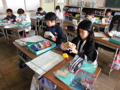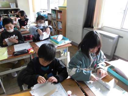 3学期の図工が始まりました。今日は「ゴムの力でトコトコ」の組み立てを行いました。木工用ボンドを出しすぎないように、上手に組み立てていました。