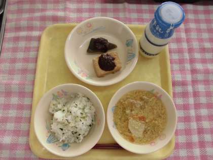 今日は、菜飯とみそ田楽を合わせた「菜飯田楽」です。細かく刻んだ大根の葉を混ぜたごはんと、赤みそを使って作った田楽をセットで味わってください。田楽だけで食べるとみその味が強いですが、次に菜飯を食べることで大根の葉の風味が口の中をさっぱりさせてくれます。この組み合わせは、江戸時代から東海道名物として旅人に親しまれ、葛飾北斎の浮世絵でも菜飯田楽が描かれたものがあります。この辺りの地域では、犬山市で「菜飯田楽」が庶民の味として親しまれています。