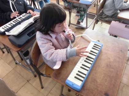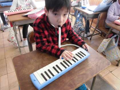 けんばんハーモニカの練習を頑張っています。2学期よりも難しい曲ですが、指やリズムに気をつけて演奏することができるようになってきました。