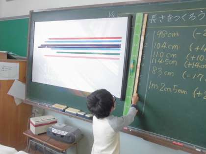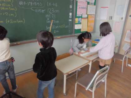 長さの学習で、1メートルを紙テープで作りました。1メートルの量感をつかみ、教室の中にある1メートルの長さの物を探しました。ものさしを使って、長さを測りながら探すことができました。