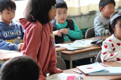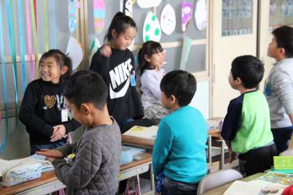 子どもたちはたくさん発言をして、実際に考えたあいさつをしてみました。