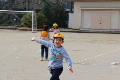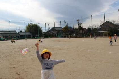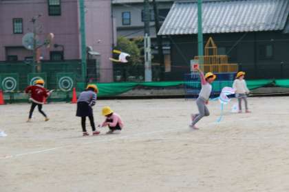 凧揚げをしました。走ると高く揚がることに気づき、みんな一生懸命走っていました。