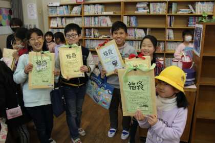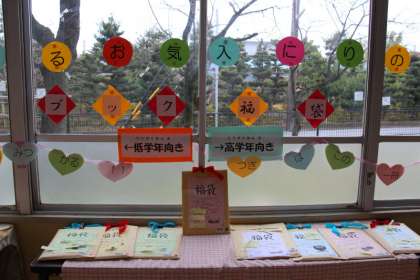 今日から、読書週間です。今日は、どんな本が入っているかわからない「ブック福袋」が配られました。