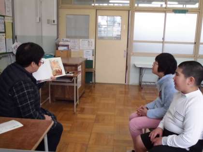 1月28日(火) 特別支援学級 読み聞かせ 公開日 2020/01/28 更新日 2020/01/28 ひまたんのまど 今朝は、みるふぃーゆさんによる読み聞かせがありました。本の題名は「パパのしごとはわるものです」という絵本でした。やさしい読み聞かせに、時折笑顔になりながら聞いていました。