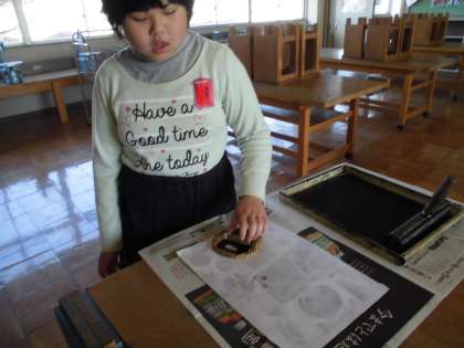 図工の時間に紙版画を行いました。いろいろな模様の紙を好きな場所に貼って、ローラーでインクを塗って仕上げました。