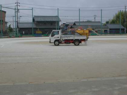 今日の学校の運動場は一面真っ白です。運動場に防塵剤という薬をまいて、砂ぼこりが立たないようにしています。暑い夏のグランドは砂ぼこりが立ちやすく、吸ってしまうと咳き込んでしまうので、今のうちからそれを防いでいるのです。