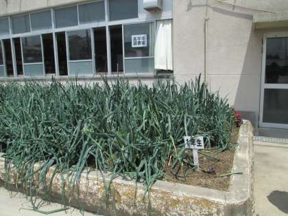 1ねんせいのかだんには、たまねぎが たくさん うわっていました。