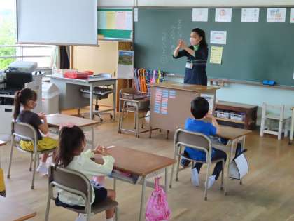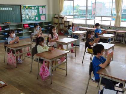今日は分散登校日Bでした。みんな、久しぶりの学校生活でドキドキ緊張しているのが伝わってきました。ゴッシーのうたにあわせて手洗いをして、一人一人課題を集めて、くつの入れ方を学びました。