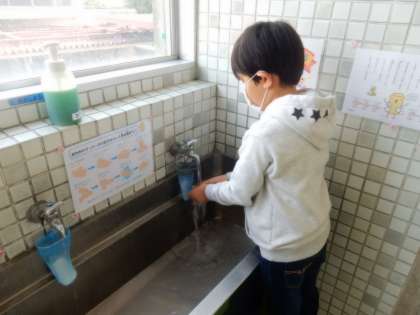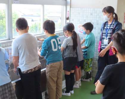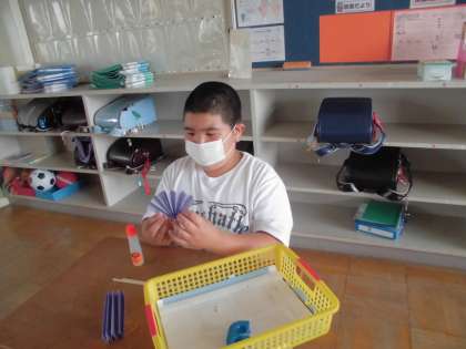 交流先で、手洗いを教えてもらったり、一緒に算数で使う扇づくりをしたりしました。