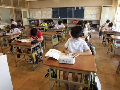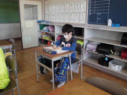 分散登校で、教室には半分の児童が登校しました。