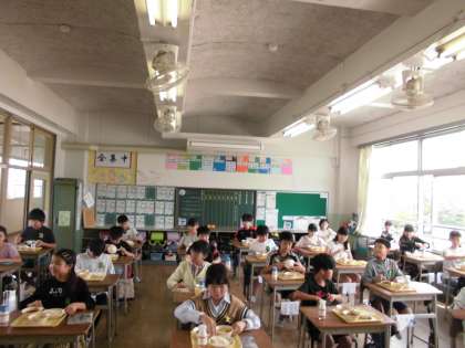 今日から給食が始まりました。普段なら楽しく会話しながら食べる楽しい給食も、しばらくの間は全員前向きで静かに食べます。笑顔あふれる会食の時間が早く来ることを願っています。
