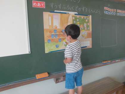 教科書の絵に数図ブロックを置き、それぞれを並べて比べました。