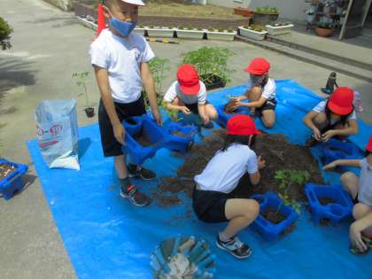 ミニトマトの苗を植えました。みなさん話をしっかり聞いて、すばやく苗植えができました。
