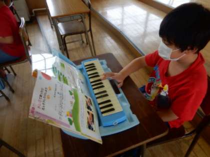 挙手して発言したり、音楽記号を覚えたり、鍵盤ハーモニカで指使いを確認したりしました。