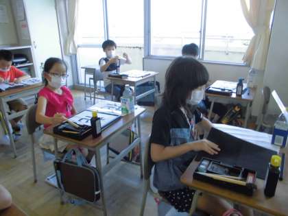 書写の時間は、「花」の文字を書きました。「はらい」や、「曲がり」に気をつけて書くことができました。小筆を使って、名前の練習も行いました。手本を見ながら、ゆっくり、ゆっくり丁寧に書くことができました。