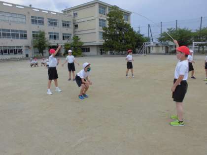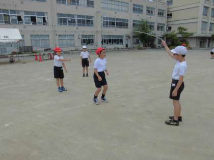 今日は、体育で大なわを行いました。連続で跳んだり、地面に手をついたり、いろいろな跳び方に挑戦しました。回すスピードを速くしたり、ゆっくりにしたり、工夫する姿が見られました。