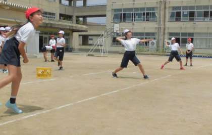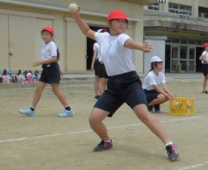 今日の体育はソフトボール投げの計測をしました。紅白玉で投球の練習をし、その後本番を行いました。遠くへ飛ばそうとする意識で、みんな斜め上を意識して投げていました。自己新記録は出せたかな?