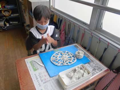 粘土を細長く伸ばして、それを丸めたり、曲げたり、積んだりして形にしていきました。