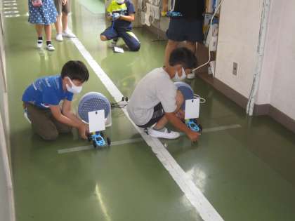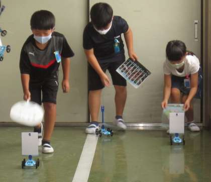 車に厚紙をつけ、後ろからうちわや送風機で風を送って走らせました。