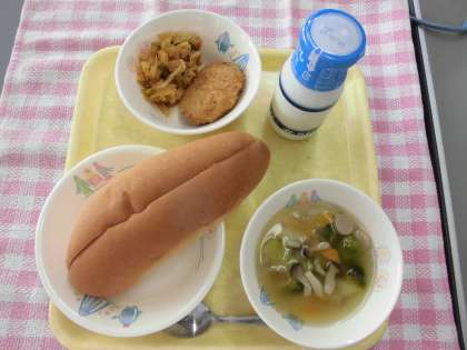 今日のサンドイッチロールパンは、パンにミンチカツや切り干しナポリタンをはさんでいただきましょう。自分で工夫して食べるのも楽しいですね。